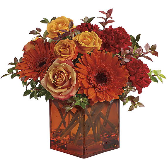 Celebrate the wonder of a new day with warm, golden flowers. A modern orange glass vase is the foundation of this stunning, sun-bright bouquet that energizes any occasion.